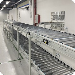 输送线主要是完成物料的输送任务,存在于环绕库房、生产车间和包装车间等场地,设置有由许多皮带输送线、滚筒输送线等组成的一条条输送链,经首尾连接形成连续的输送线,保障货物的快速、平稳输送。
